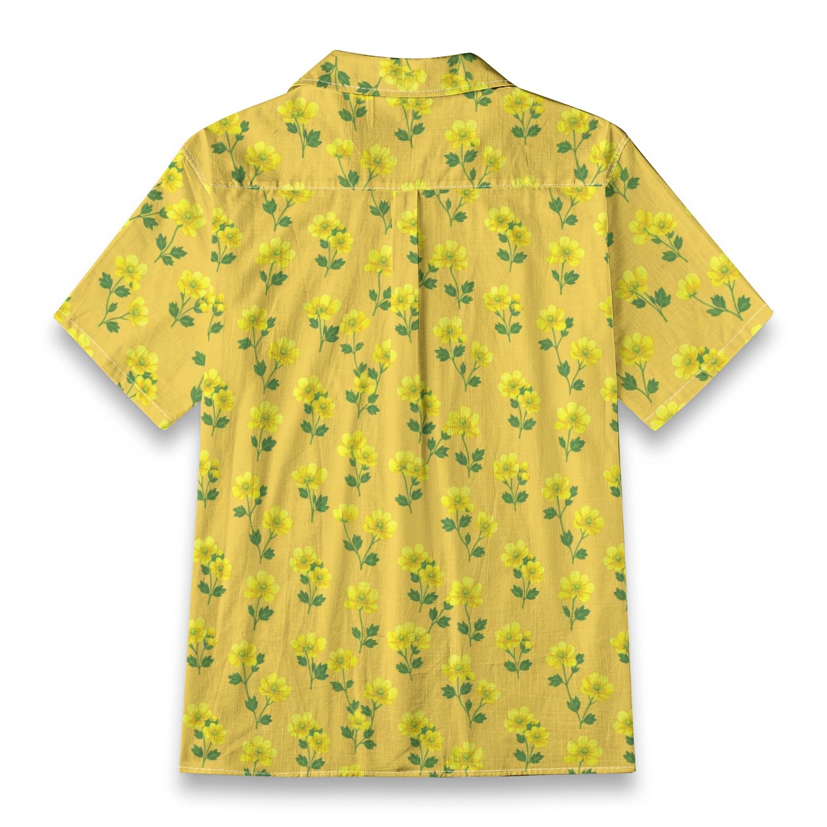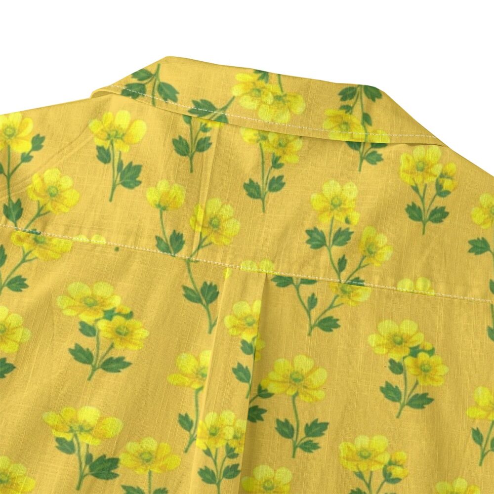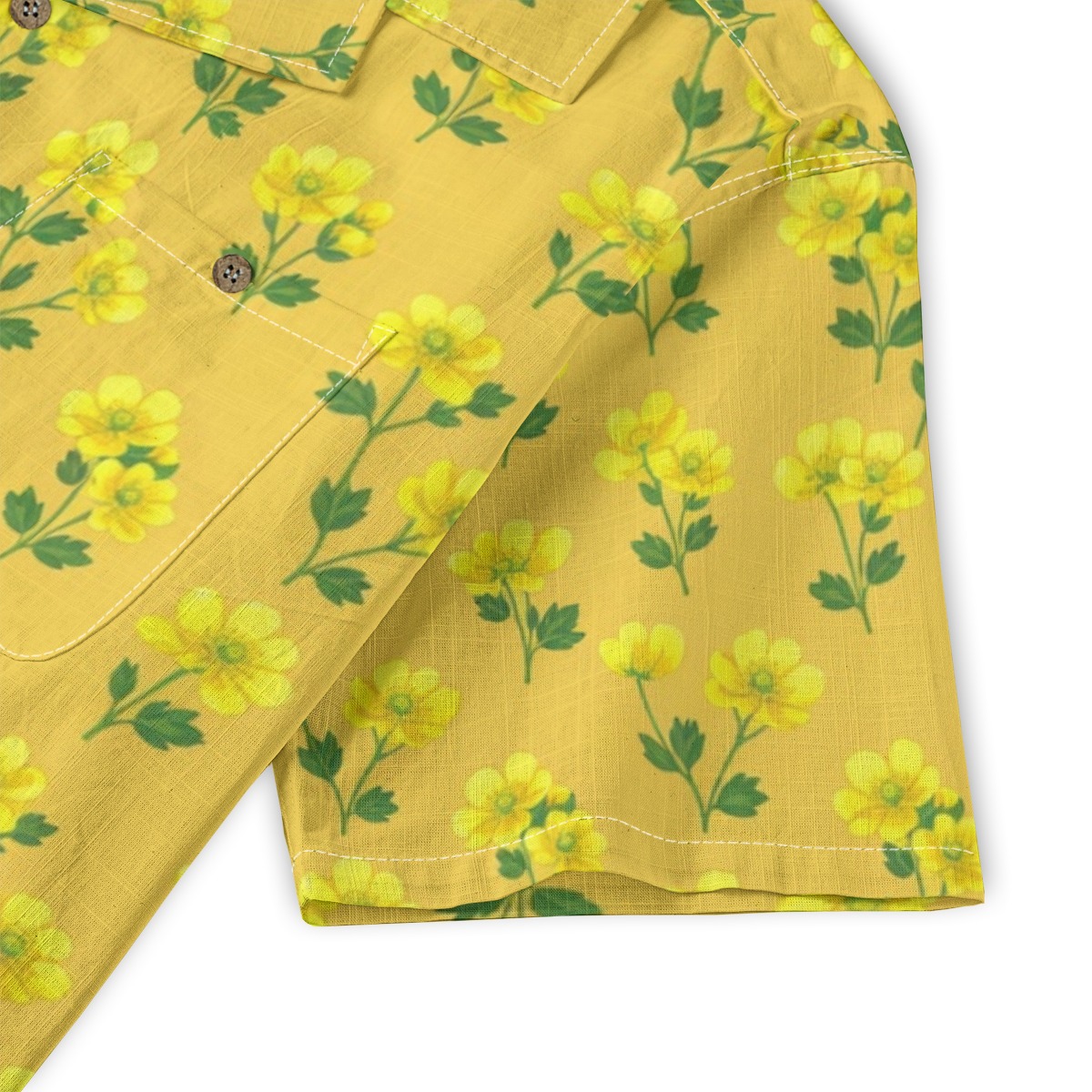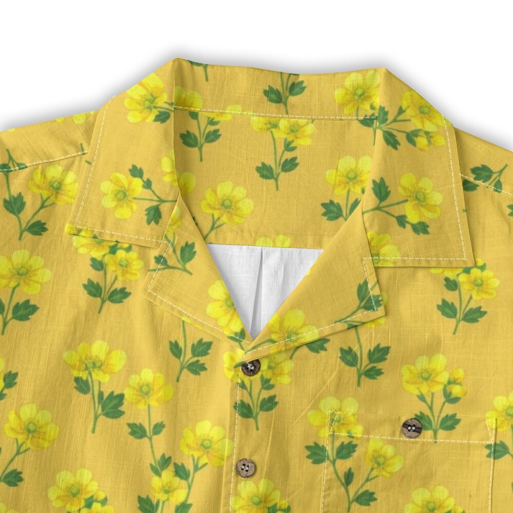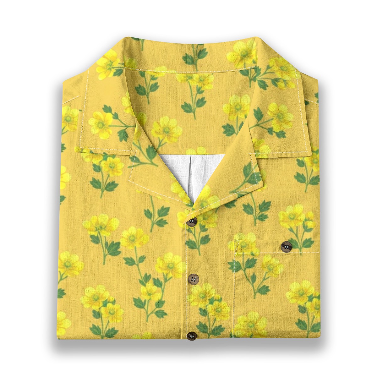 Sunny celandine flowers brighten the surface with their warm yellow tones. The lively palette blends with fresh greens, while the evenly spaced layout keeps the pattern cheerful and balanced.
