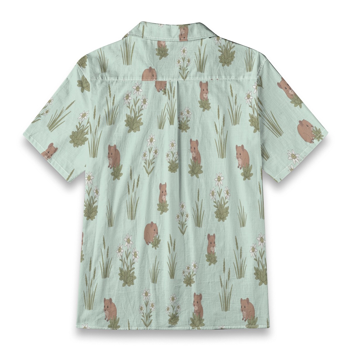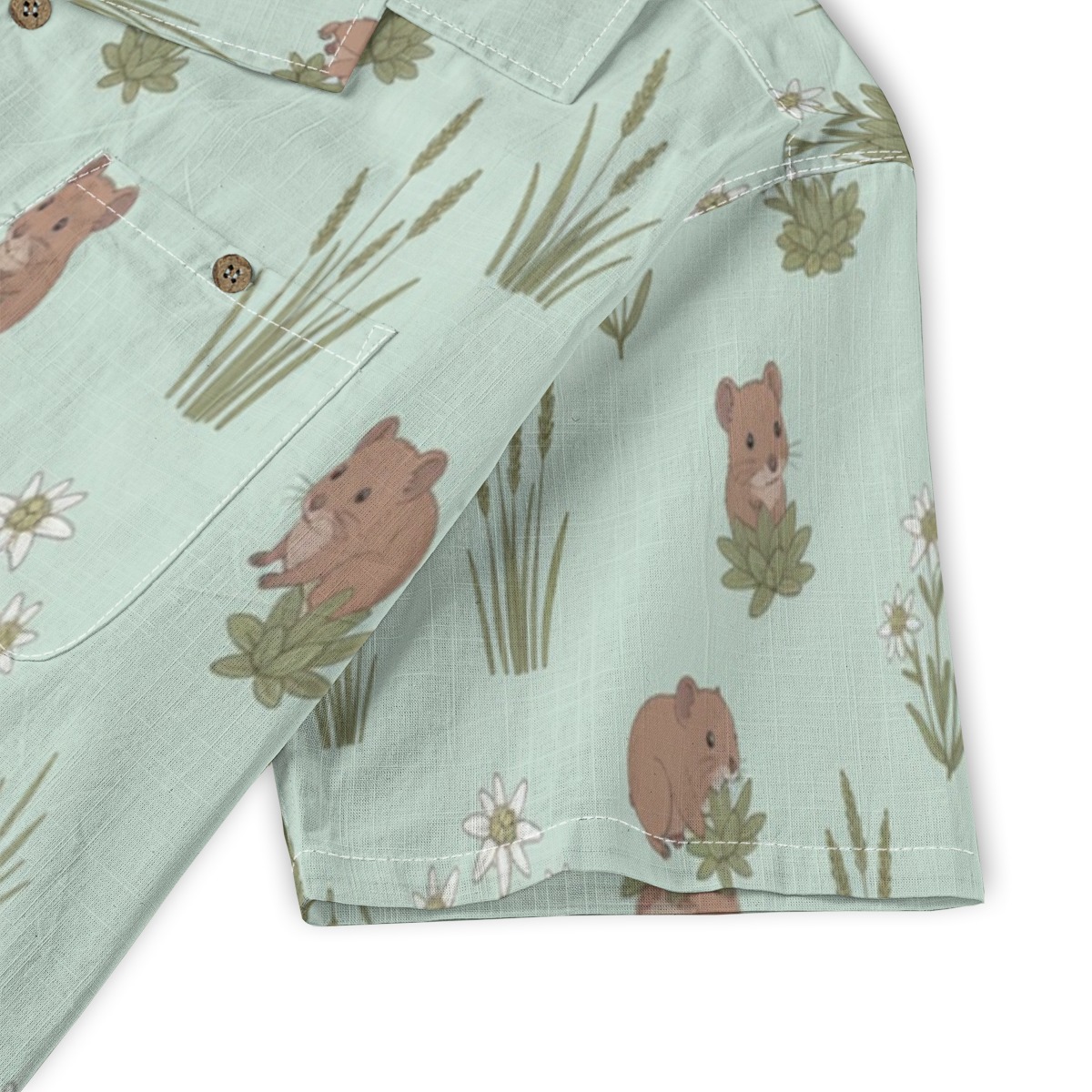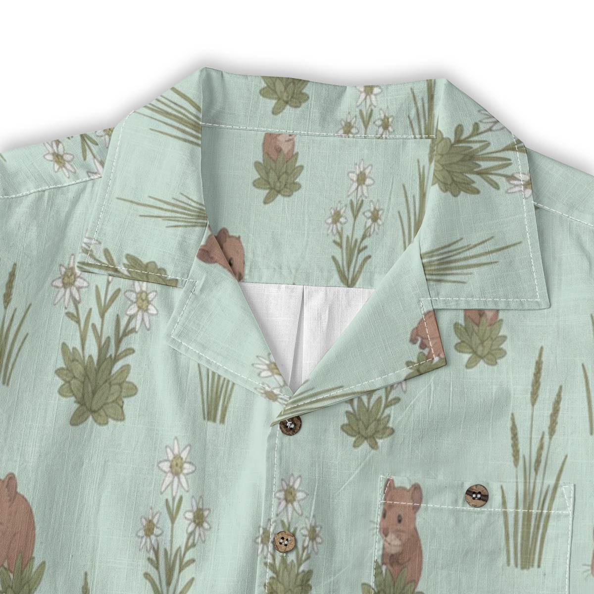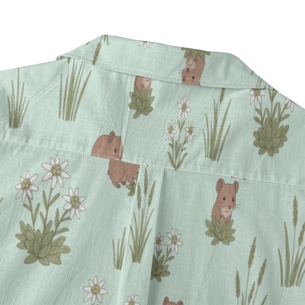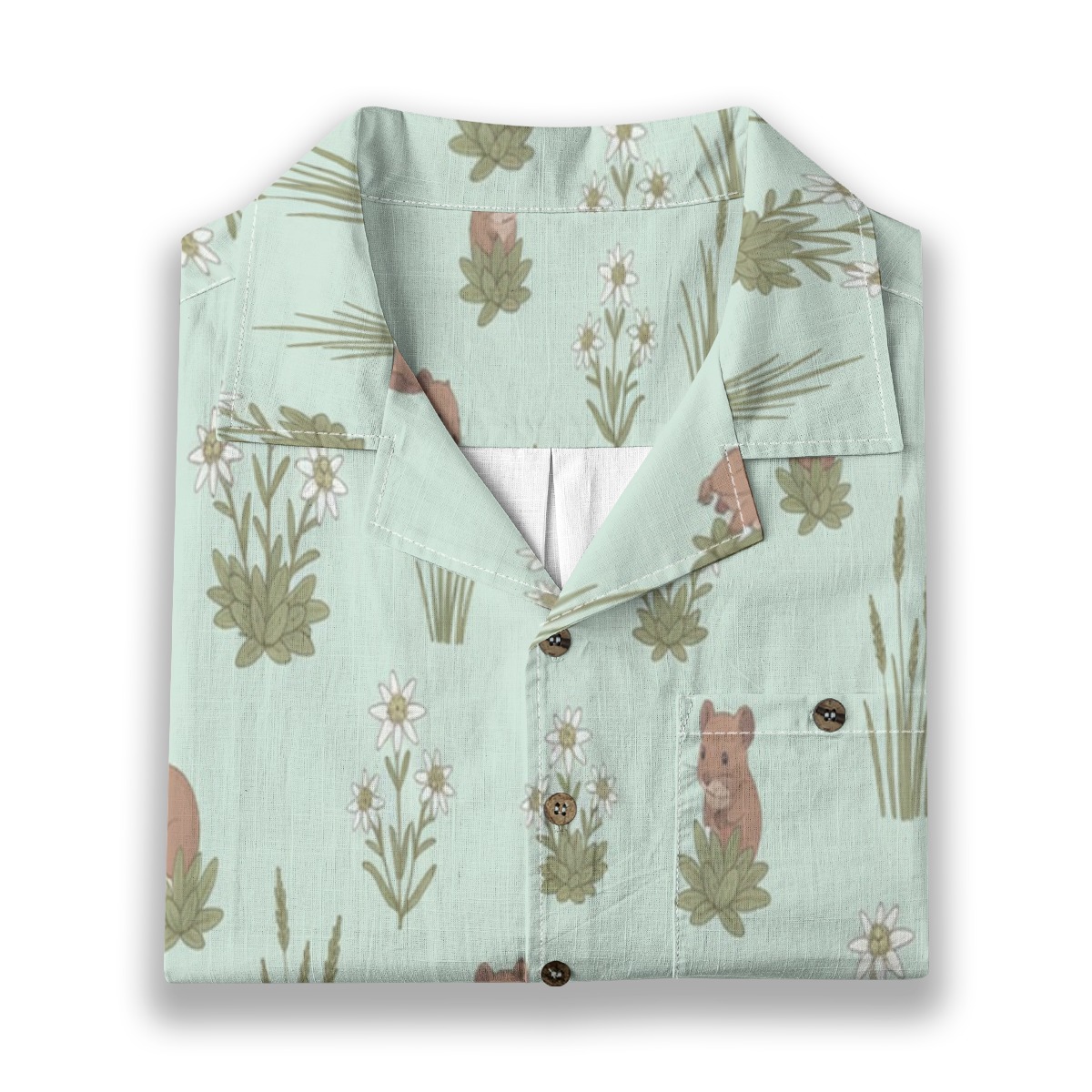Tiny pika dot the surface among gentle alpine plants, creating a light and charming pattern. The cool mint background enhances the soft natural tones, while the evenly spaced layout keeps the design airy and balanced.